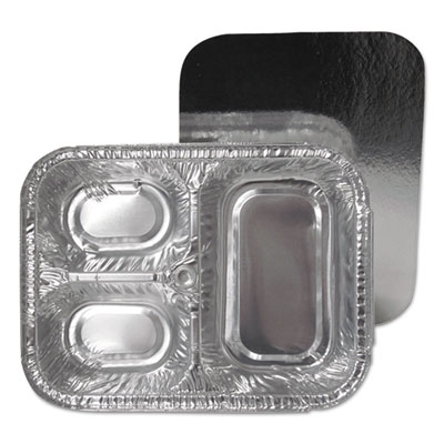 3-Compartment Oblong Aluminum Foil Container with Board Lid, 23 oz, 8.5 x 6.38 x 1.72, Silver, 250/Carton